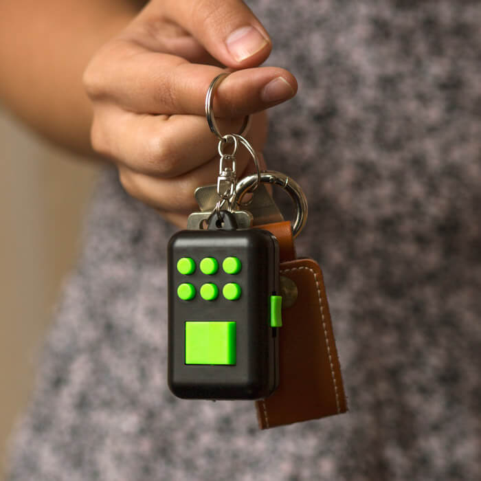 Der Schlüsselanhänger hat jede Menge Knöpfe, Zahnräder und Schalter mit denen man seine nervösen Hände und Finger beschäftigen kann.
